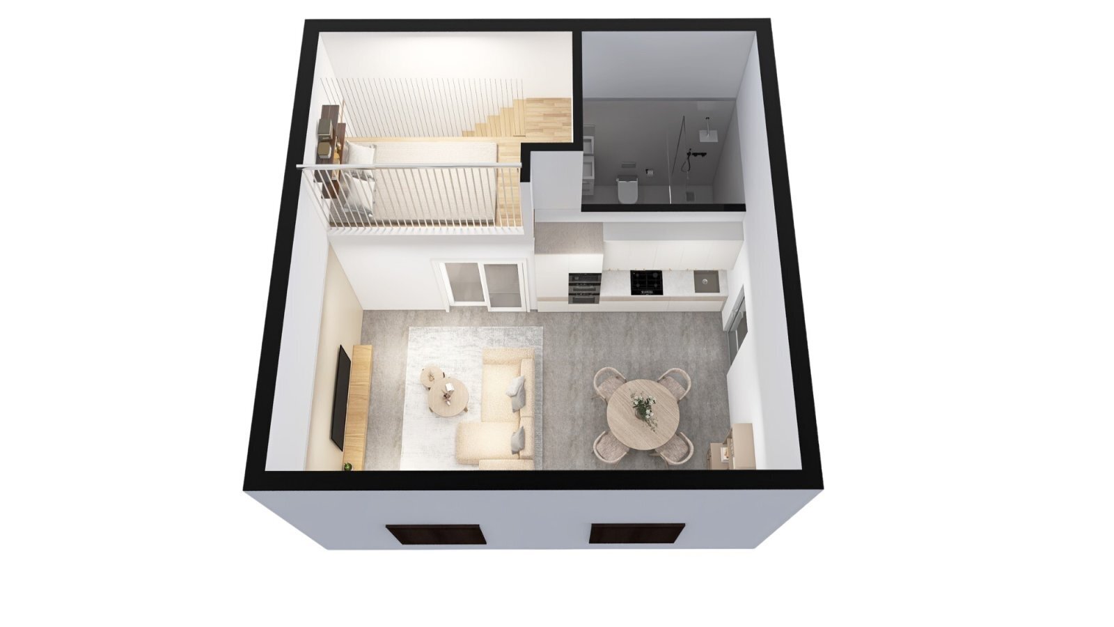 Nabízená jednotka se nachází v přízemí domu. Její rozloha je celkem 46 m2. V této rozloze je započítán i zajímavě řešený prostor pro spaní, díky kterému se v jednotce pohodlně ubytuje i čtyřčlenná rodina. V kupní ceně je zahrnuto kompletní dokončení bytové jednoty, a to včetně kuchyňské linky s vestavěnými spotřebiči, skříní v předsíni a obývací stěnou. Koupelna bude vybavena walk-in sprchou s odtokovým žlábkem, WC, skříňkou s umyvadlem a osvětleným zrcadlem. Podlaha celého bytu (kromě koupelny) bude opatřena kvalitním vinylem.