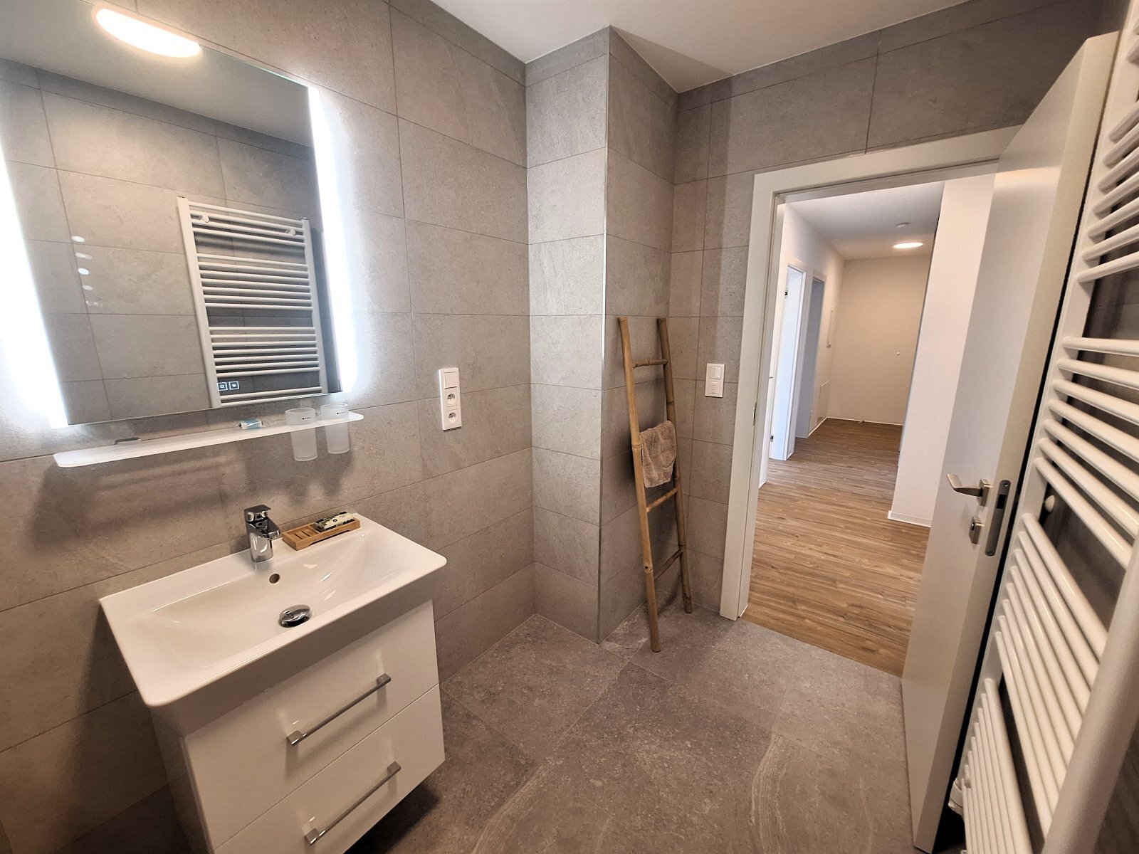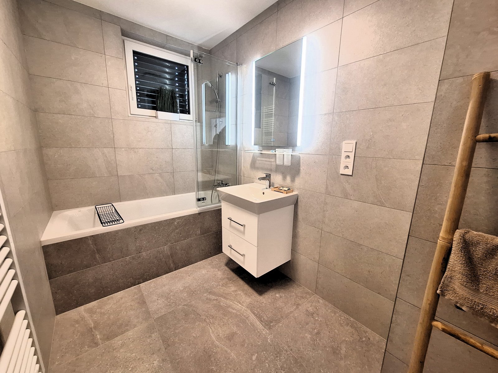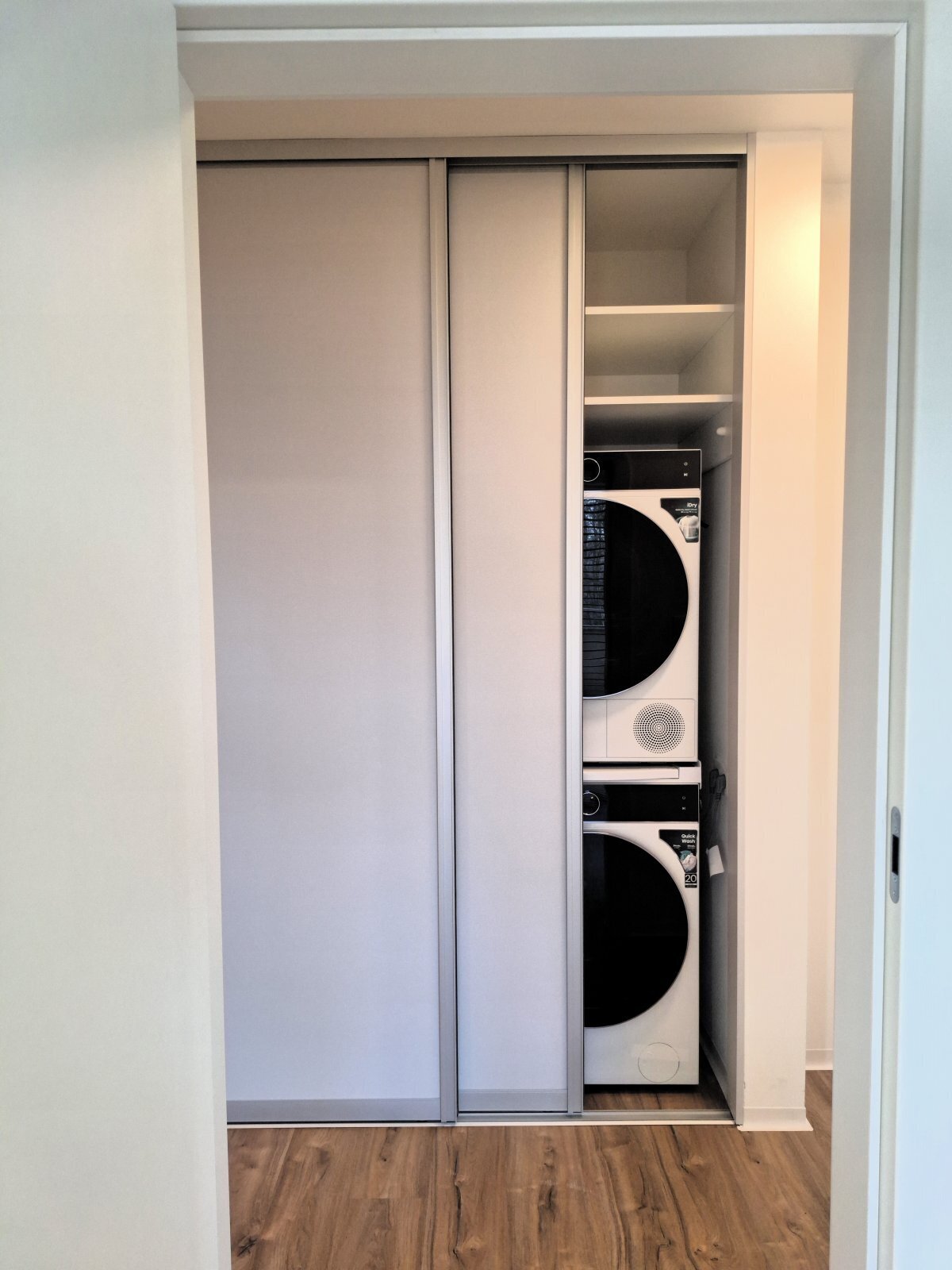 V chodbě se nachází velká vestavěná skříň s pračkou a sušičkou značky Hisense. Kuchyňská linka je vybavena vestavnou kombinovanou lednicí, myčkou, indukční varnou deskou, horkovzdušnou troubou a digestoří s odtahem. V koupelně s oknem je vana se skládací zástěnou, umyvadlo se skříňkou, zrcadlo s poličkou a elektrický žebřík. WC je oddělené.
